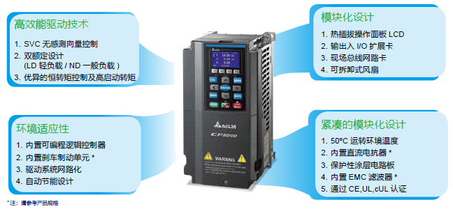 CP2000系列為無感矢量控制變頻器,延續臺達設計團隊對節能省電理念的一貫性,針對風機、水泵、HVAC Drive相關應用特制化、PID智能調適和優異設計的產業效能所推出的變頻器。其無感矢量控制(SVC)的智能表現,適時提升負載轉矩響應,滿足客戶寬廣的變轉矩負載需求,提升馬達在一般用途的效能。3段式V/F冪級曲線響應,能在變動轉矩負載的環境下,適時的調整輸入電壓來提高整體效能,特別是水泵,風機負載之類的應用。FLYING START、自動加減速功能、瞬時停電再啟動,馬達參數AUTO-TUNING等功能,對變轉矩負載的環境操作及保護,提供適當的運行及節能方案。